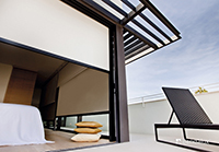 Résistance aux vents maximale et opacité totale. Les stores enrouleurs Z-Box sont équipés d’un système ultra résistant pour l'extérieur. Ils disposent de guides latéraux “zip” qui permettent de tendre parfaitement le tissu et de garantir une résistance aux vents jusqu’à 90 km/h . Il s'agit du seul système 100 % opaque grâce au guidage à glissière associé aux tissus occultants. |