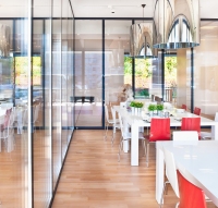 La cloison mobile GEZE MSW peut être utilisée avec les systèmes IGG (tout verre) ou GGS (avec ferrure design en acier inoxydable) offrant ainsi une grande liberté de conception et des possibilités d'aménagement très design. Monté avec des vantaux en verre, le système joue la transparence, avec des vantaux en bois, il peut créer des espaces plus « cosy ».