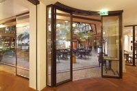 Notre multiplicité de variantes permet d'offrir la solution optimale pour tous les bâtiments et leurs entrées : 2 ou 4 vantaux, installations convexes ou concaves, raccordements latéraux et supérieurs au béton, au mur, à l'ossature en acier, à la construction en verre ainsi qu'à la conception à montants et traverses. Les vantaux fixes et mobiles peuvent être dotés de profilés d'encadrement fins ou de systèmes de ferrure GEZE GGS (tout-verre). Les vantaux mobiles sont accrochés respectivement par deux supports sur le chariot. Le guide au sol est également fixé par des supports par point sur le verre.